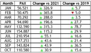 Tokom perioda januar – oktobar 2022. godine, Međunarodni aerodrom Sarajevo je prihvatio 1.242.066 putnika, što je 2022. godinu učinilo najprometnijom ikada. Ta cifra je porasla za 22,1 posto u odnosu na 2019. godinu ili dodatnih 224,462 putnika.