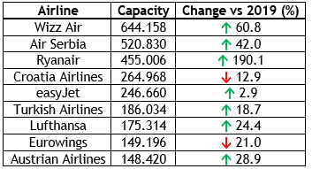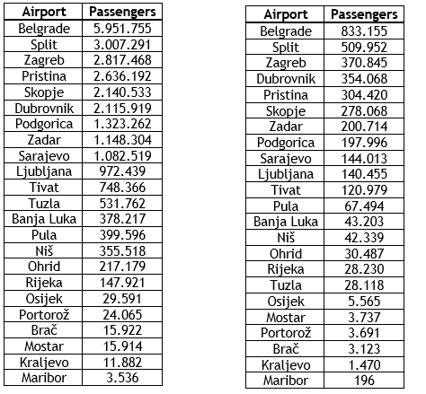 Beogradski aerodrom je u periodu januar-septembar bio na 73. mjestu po prometu na kontinentu, odmah iza Keflavika (Rejkjavik), Malte i Sevilje, ali ispred Sofije, Glazgova i Soluna. Split se pozicionirao kao 108. najprometniji, između Wroclawa i Stavangera u Norveškoj, dok je Zagreb zauzeo 114. mjesto. Bio je iza Tirane, Pafosa, Olbije, ali ispred Verone i Tbilisija. Priština je bila 118. na listi, iza Santiaga de Compostele, ali ispred London Cityja, Kluža i Santorinija. Skoplje je zauzelo 128 mjesto, iza Talina, Kišinjeva i Korka, ali odmah ispred Memingena, Dubrovnika i Ponta Delgade.