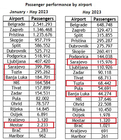Prvi put ove godine sarajevski aerodrom je u maju prevezao više putnika od ljubljanskog, dok je Rijeka prevezla manje putnika nego u maju prošle godine. Riječ je o drugom mjesecu zaredom u kojem su brojke u Rijeci pale u odnosu na prethodnu godinu, a predviđa se da će aerodrom u 2023. usporiti trend u odnosu na druge u Hrvatskoj i prevesti manje putnika nego 2022. godine.
