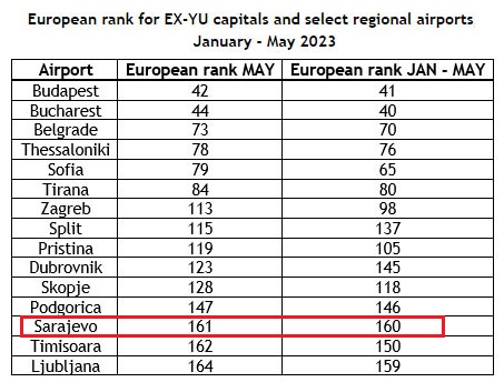 Beogradski aerodrom je u periodu januar-maj 2023. bio na 70. mjestu po prometu u Evropi, odmah iza Štutgarta, Malte i Ajndhovena, ali ispred Rejkjavika, Larnake i Soluna. Zagreb je također ušao u prvih 100, zauzimajući 98. mjesto, pozicionirajući se iza Kaljarija, Stavangera u Norveškoj i Hanovera, ali ispred London Cityja, Tbilisija i Prištine.