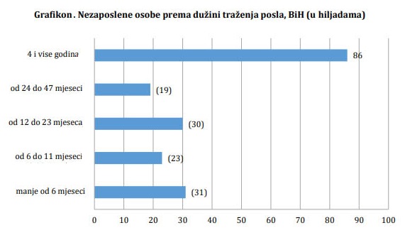 posao od 12 mjeseci do dvije godine. Broj nezaposlenih osoba koje su tražile posao dvije godine i duže iznosio je 105 hiljada ili 55,7%.