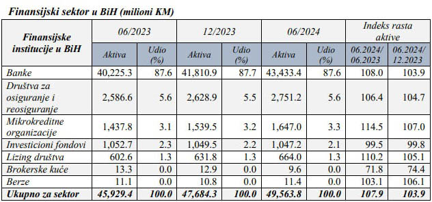 Ukupna aktiva finansijskog sektora u Bosni i Hercegovini je na polugodištu 2024. godine iznosila 49,56 milijardi KM (nekonsolidovani podaci) i veća je za 3,63 milijarde KM ili za 7,9% u odnosu na isti period prethodne godine.