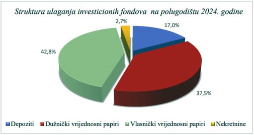U strukturi ulaganja investicionih fondova najveće učešće imaju ulaganja u vlasničke vrijednosne papire oko 42,8%, zatim ulaganja u dužničke vrijednosne papire 37,5%, ulaganja u depozite 17,0% i najmanji procenat od 2,7% se odnosi na ulaganja u nekretnine.