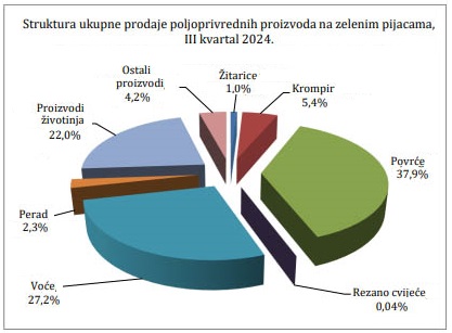 U strukturi ukupne prodaje poljoprivrednih proizvoda na zelenim pijacama u trećem kvartalu 2024. godine povrće je učestvovalo sa 37,9%, žitarice sa 1,0%, krompir sa 5,4%, voće sa 27,2%, perad sa 2,3%, proizvodi životinja sa 22,0%, ostali proizvodi sa 4,2% i rezano cvijeće sa 0,04%, saopćeno je iz Agencije za statistiku BiH.
