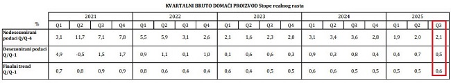 Desezonirana serija podataka pokazuje rast BDP-a u trećem kvartalu 2025. godine od 0,5% u odnosu na prethodni kvartal.