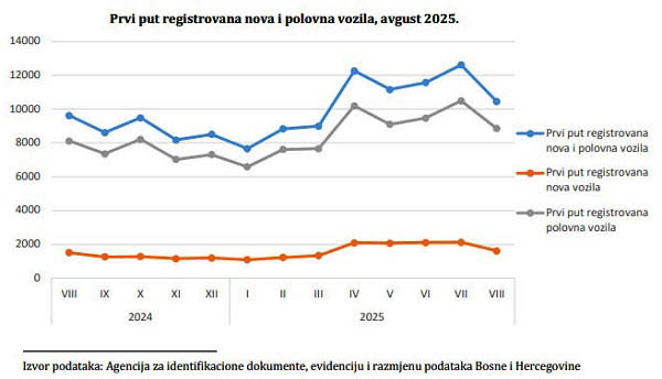 U Bosni i Hercegovini je u avgustu 2025. prvi put registrovano 10.452 motorna vozila, što je rast od 8,7% u broju prvi put registrovanih motornih vozila u odnosu na isti mjesec prethodne godine.
