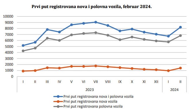 U februaru 2024. godine od ukupnog broja prvi put registrovanih novih vozila 48,6% vozila registrovano je od strane fizičkih lica.