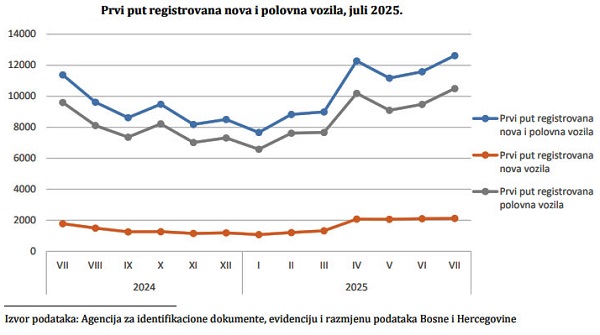 U Bosni i Hercegovini je u julu 2025. prvi put registrovano je 12.618 motornih vozila, što je porast od 10,9% u odnosu na isti mjesec prethodne godine.