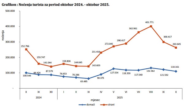 Turisti su oktobru 2025. ostvarili 373.806 noćenja, što je manje za 11,4% u odnosu na mjesec ranije i za 5,8% više u odnosu na oktobar 2024. godine. U strukturi ukupno ostvarenih noćenja učešće domaćih turista je 29,5%, dok je 70,5% učešće stranih turista.