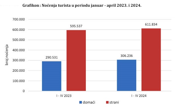 U periodu januar – april 2024. turisti su ostvarili 918.070 noćenja, što je za 3,6% više