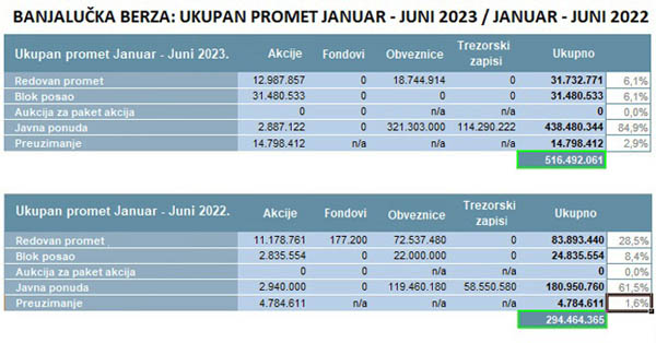 Na Banjalučkoj berzi (BLSE) je u prvih šest mjeseci 2023. godine ostvaren ukupan promet u iznosu od 516,49 miliona KM što je u odnosu na isti period prošle godine (294,46 miliona KM) povećanje čak za 222 miliona KM ili za 75,4 posto, saznaje poslovni portal Profitiraj.ba.
