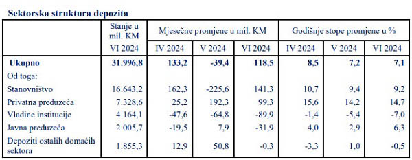 Ukupni depoziti domaćih sektora na kraju juna 2024. godine iznosili su 32 milijarde KM, i u odnosu na prethodni mjesec depoziti su povećani za 118,5 miliona KM (0,4%). Povećanje depozita na mjesečnom nivou registrovano je kod sektora stanovništva za 141,3 miliona KM (0,9%) i kod privatnih preduzeća za 99,3 miliona KM (1,4%). Depoziti su smanjeni kod nefinansijskih javnih preduzeća za 31,9 miliona KM (1,6%), kod vladinih institucija za 89,9 miliona KM (2,1%) i kod ostalih domaćih sektora za 0,3 miliona KM.