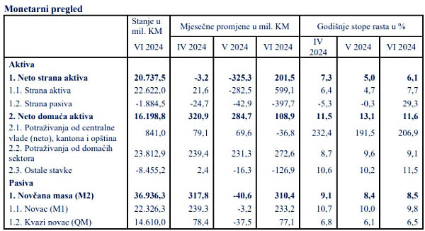 Protustavka povećanju novčane mase na mjesečnom nivou u junu 2024. u iznosu od 310,4 miliona KM (0,8%) je povećanje neto strane aktive (NSA) za 201,5 miliona KM (1,0%) i povećanje neto domaće aktive (NDA) za 108,9 miliona KM (0,7%). Porast novčane mase na godišnjem nivou od 2,88 milijardi KM (8,5%), rezultat je porasta neto strane aktive za 1,2 milijarde KM (6,1%) i neto domaće aktive za 1,69 milijardi KM (11,6%).