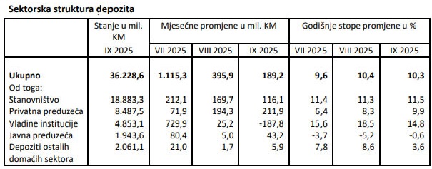 Godišnja stopa rasta ukupnih depozita u septembru 2025. iznosila je 10,3%, što je u apsolutnom iznosu 3,39 milijardi KM. Godišnji rast depozita registrovan je kod sektora stanovništva za 1,95 milijardi KM (11,5%), u čijoj strukturi su transakcioni računi porasli za 17,3%, depoziti po viđenju za 6,1% i oročeni depoziti za 6,5%. Rast depozita je također zabilježen kod privatnih preduzeća za 764 miliona KM (9,9%), kod vladinih institucija za 624,8 miliona KM (14,8%) i kod ostalih domaćih sektora za 71,4