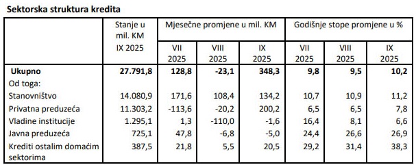 Godišnja stopa rasta ukupnih kredita u septembru 2025. iznosila je 10,2%, nominalno 2,58 milijardi KM. Godišnji rast kredita registrovan je kod sektora stanovništva za 1,42 milijarde KM (11,2%), kod privatnih preduzeća za 820,3 miliona KM (7,8%), kod vladinih institucija za 80,1 milion KM (6,6%), kod nefinansijskih javnih preduzeća za 153,5 miliona KM (26,9%) i kod ostalih domaćih sektora za 107,4 miliona KM (38,3%).