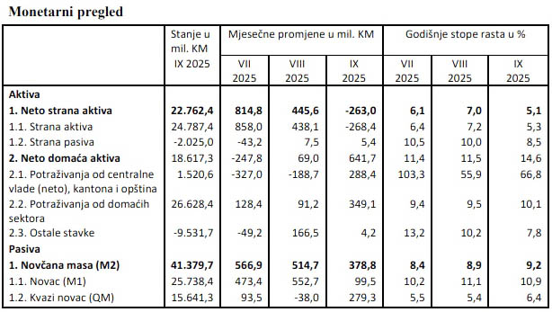 Ukupna novčana masa (M2) na kraju septembra 2025. godine iznosila je 41,38 milijardi KM i u odnosu na prethodni mjesec registrovano je povećanje novčane mase za 378,8 miliona KM (0,9%). Povećanje novčane mase rezultat je povećanja novca (M1) za 99,5 miliona KM (0,4%) i kvazi novca (QM) za 279,3 miliona KM (1,8%).