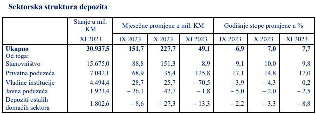 Godišnja stopa rasta ukupnih depozita u novembru 2023. godine iznosila je 7,7%, što je u apsolutnom iznosu 2,2 milijarde KM. Godišnji rast depozita registriran je kod sektora stanovništva za 1,4 milijarde KM (9,8%), kod privatnih poduzeća za 1,02 milijarde KM (17,0%) i kod vladinih institucija za 7 miliona KM (0,2%). Depoziti su na godišnjem nivou smanjeni kod nefinansijskih javnih poduzeća za 49,1 milion KM (2,5%) i kod ostalih domaćih sektora za 174 miliona KM (8,8%).