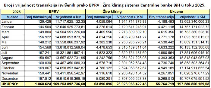 Od toga je broj transakcija po sistemu BPRV-a iznosio nešto više od 1,8 miliona vrijednih oko 169,25 milijardi KM, dok je vrijednost Žiro kliring transakcija iznosila oko 28,03 milijarde KM i 53,9 miliona transakcija. Broj transakcija u sistemu BPRV je u 2025. povećan za 9,5 posto, a vrijednost transakcija je povećana za 7,7 posto u odnosu na 2024. godinu.