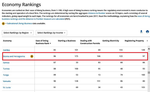 Bosna i Hercegovina je u danas objavljenom izvještaju Svjetske banke ‘Doing Business 2017’ je po lakoći poslovanja pozicionirana na 86. mjestu, i nazadovala je za sedam pozicija u odnosu na prošlogodišnje 79. mjesto.