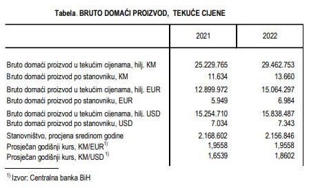 Bruto domaći proizvod (BDP) u tekućim cijenama u Federaciji BiH za 2022. godinu iznosi 29 milijardi i 462,75 miliona KM (15 milijardi i 64,30 miliona eura) i nominalno je veći za 16,8 posto u odnosu na 2021. godinu kada je iznosio oko 25 milijardi i 229,76 miliona KM (12 milijardi i 899,97 miliona eura).