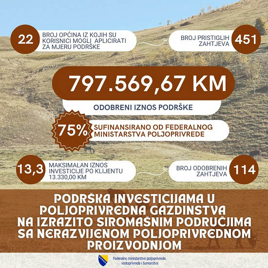 U okviru mjere ‘Investicije u poljoprivredna gazdinstva na izrazito siromašnim područjima sa nerazvijenom poljoprivrednom proizvodnjom’ resorno federalno ministarstvo podržalo je poljoprivredne proizvođače s 75 posto iznosa investicije ograničene na iznos do 13.333 KM. Na ovaj način ministarstvo je podržalo 114 poljoprivrednih proizvođača na izrazito siromašnim područjima sa nerazvijenom poljoprivrednom proizvodnjom s iznosom većim od 797.000 KM.
