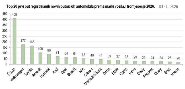 Prema marki motornih vozila u prvom kvartalu 2026. godine među prvi put registrovanim novim vozilima najviše je škoda, Volkswagena, Toyota, Renaulta, Hyundaia, Audija…. podaci su Zavoda za statistiku FBiH.