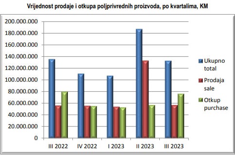 Od toga ukupna vrijednost prodaje poljoprivrednih proizvoda u trećem kvartalu 2023. godine iznosi oko 57 miliona KM što je povećanje za 1,2% u odnosu na isti period lani, dok u istom periodu ukupna vrijednost otkupa poljoprivrednih proizvoda iznosi oko 76,1 milion KM što je manje za 4,2% u odnosu na treće tromjesečje 2022. godine, saopćeno je iz Federalnog zavoda za statistiku.
