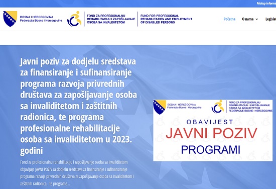 Federalno ministarstvo rada i socijalne politike saopćilo je da su u Fondu za profesionalnu rehabilitaciju i zapošljavanje osoba sa invaliditetom u toku dva javna poziva namijenjena osobama sa minimalno 60 posto invaliditeta, te osobama sa invaliditetom koje imaju namjeru pokrenuti vlastiti obrt, a kojim se podržava zapošljavanje i samozapošljavanje osoba sa invaliditetom.
