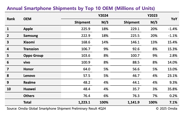 Samsung je isporučio 222,9 miliona telefona, iako uz manji pad od 1,1%. Njihova nova serija Galaxy S24, koja donosi napredne mogućnosti umjetne inteligencije, pokazala se kao dobar poslovni potez, posebno na tržištima zapadne Evrope i SAD-a.