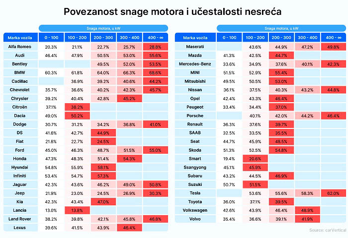 U istraživanju carVerticala pregledani su izvještaji o istoriji vozila 43 marke automobila. U svim su slučajevima automobili sa snažnijim motorima bili su skloniji prometnim nesrećama.