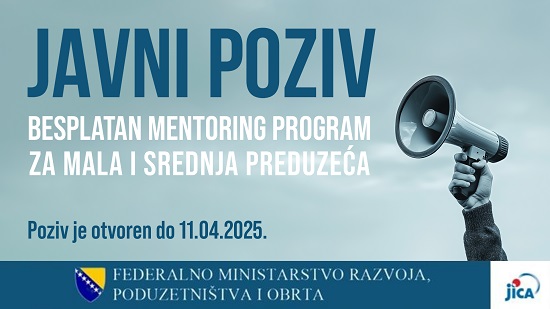 Federalno ministarstvo razvoja, poduzetništva i obrta objavilo je Javni poziv za dodjelu bespovratnih sredstava u 2025. godini. Predmet ovog javnog konkursa je prikupljanje prijava za odabir korisnika grant sredstava i usluga mentoringa u Federaciji BiH.