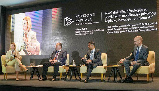 U panel diskusiji ‘Strategija za održivi rast: mobilizacija privatnog kapitala, inovacije i primjena AI’ učestvovali su Ilija Studen, predsjednik Uprave STUDEN&Co Holding, Bhavit Sawjani, Investment manager/Consultant i Omar Selim, Osnivač Arabesque Group i ESG Book.