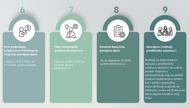 Preliminarna rang lista primljene djece bit će objavljena 18. maja. Nakon objave, roditelji mogu podnijeti prigovor u periodu od 18. do 22. maja. Prigovori će biti razmatrani do 1. juna, kada će biti objavljena konačna rang lista primljene djece u sistemu EMIS-predškolsko.