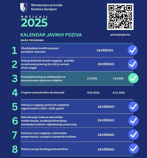 Ministarstvo privrede Kantona Sarajevo objavilo je novi Javni poziv za dostavljanje prijava u svrhu dodjele finansijskog poticaja s inkubacijom za novoosnovane poslovne subjekte. Ovaj program predstavlja stratešku mjeru podrške razvoju poduzetništva, s ciljem jačanja lokalne ekonomije, otvaranja novih radnih mjesta i stvaranja povoljnijeg poslovnog ambijenta za mlade i inovativne ljude u BiH.