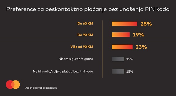 Iznos od 60 KM je trenutna granica do koje nije potrebno unositi PIN kod prilikom beskontaktnih plaćanja Mastercard karticama i za 28% ispitanika, taj limit je odgovarajući. Međutim, 19% ispitanika je izrazilo spremnost da plaća beskontaktno bez unosa PIN koda iznose do 90 KM, dok bi još 23% bilo spremno da tako plaća i iznad 90 KM.