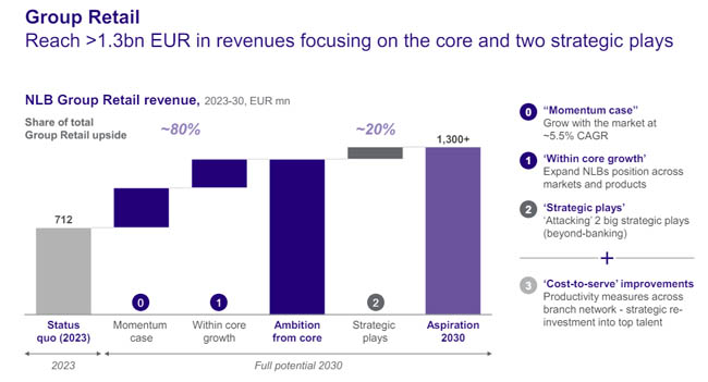 U segmentu poslovanja sa stanovništvom, strateški cilj do 2030. je biti vodeća banka u regionu, povećati broj klijenata na preko 3 miliona i postići više od 80% digitalne penetracije. Do 2030. godine, NLB Grupa će biti vodeća u segmentu malih i srednjih preduzeća, a istovremeno će također imati vodeću ulogu i u oblasti tranzicijskog finansiranja, gdje će volumen takvih kredita u 2030. godini iznositi 3,2 milijarde eura.