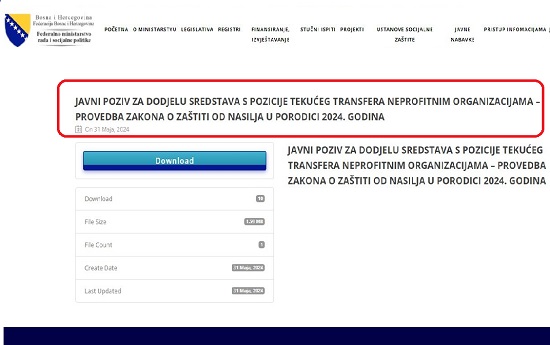 Federalno ministarstvo rada i socijalne politike objavilo je Javni poziv za dodjelu sredstava neprofitnim organizacijama koje rade na provedbi Zakona o zaštiti od nasilja u porodici. Ova sredstva u ukupnom iznosu od milion KM, namijenjena su za pružanje socijalnog zbrinjavanja i podrške žrtvama porodičnog i rodno zasnovanog nasilja.