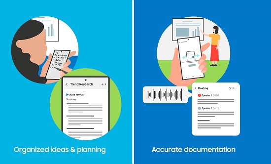 Funkcija Transcript Assist pravi sveobuhvatne, tačne bilješke sastanaka i razgovora. Jednostavno snimite sastanak preko Samsungaplikacije za snimanje glasa, a nakon toga će vam Transcript Assist ponuditi da ga pretvori u tekst, sa razdvojenim rečenicama pojedinačnih govornika. Kada dobijete transkript, možete da ga podijelite sa kolegama u tom obliku ili da ga pošaljete u Samsung Notes i dodate sažetak po tačkama koji generiše AI korištenjem funkcije Note Assist.
