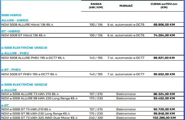 Što se tiče cijena na tržištu BiH, u ponudi izdavajamo novi 5008 Allure hibrid 136 KS koji košta 68.806 KM, električni 5008 Allure 73 kWh 210 košta 86.324 KM, dok novi 5008 Allure PHEV 195 e-DCT do registracije košta 89.921 KM.