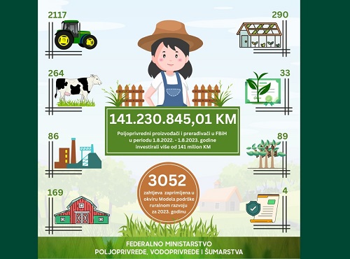 Iz Federalnog ministarstva poljoprivrede, vodoprivrede i šumarstva saopćeno je da su za posljednjih godinu dana poljoprivredni proizvođači i prerađivači u Federaciji BiH investirali 141.230.845 KM. Rezultat je to 3.052 zahtjeva koliko ih je ovo federalno ministarstvo primilo u okviru Modela podrške ruralnom razvoju za 2023. godinu, a odnose se na ulaganja za period 1.8.2022. -1.8.2023. godine.