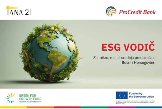 U društvu predstavnika i predstavnica medija, ProCredit Bank i TANA 21 jučer su u Sarajevu predstavili prvi bosanskohercegovački ESG Vodič za mikro, mala i srednja preduzeća (MMSP). Radi se o sveobuhvatnom priručniku čija je osnovna namjena da pomogne kompanijama, ali i široj javnosti, da ispravno koriste termine i uključuju ESG smjernice u poslovanje i izvještavanje.