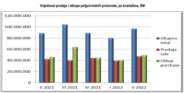 Prema podacima Federalnog zavod za statistiku, ukupna vrijednost prodaje proizvoda poljoprivrednih preduzeća i zemljoradničkih zadruga u drugom kvartalu 2022. iznosi oko 47,17 miliona KM, što je povećanje za 10,7% u odnosu na drugo tromjesečje 2021. godine.