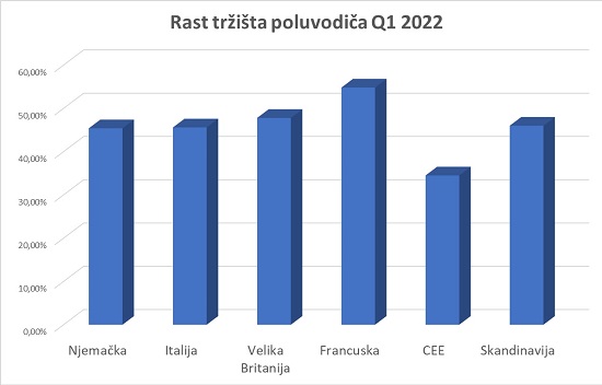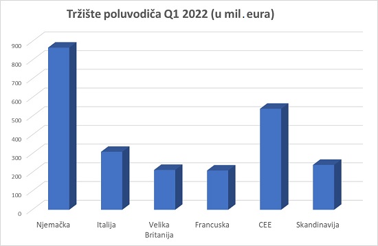 Tržište poluvodiča, po evropskim zemljama i regijama u prvom tromjesečju ove godine slično je prethodnom tromjesečju, odnosno četvrtom kvartalu 2021. godine (Q4 2021) s velikim rastom na najvećim nacionalnim tržištima.