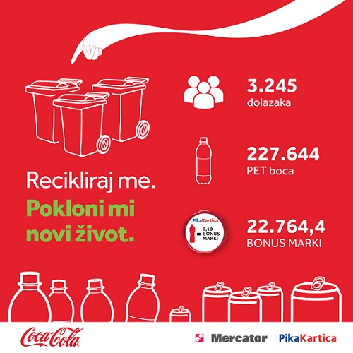 Rezultat ovogodišnjeg zajedničkog projekta ‘Recikliraj me. Pokloni mi novi život.’ Coca-Cole HBC B-H Sarajevo, Mercatora i Pika Kartice je prikupljenih 227.644 PET boca, čime je dodijeljeno 22.764,40 bonus marki na Pika Kartici svim građanima odnosno vlasnicima Pika Kartica koji su vrijedno i predano učestvovali u ovome projektu tokom juna i jula.
