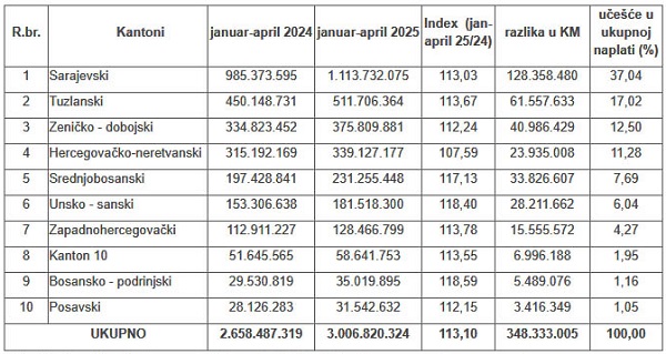 Porezna uprava FBiH saopćila je da su porezni obveznici Federacije BiH u periodu januar-april 2025. godine uplatili 3.006.820.324 KM javnih prihoda, što je u odnosu na isti period 2024. godine više za 348.333.005 KM, ili za 13,10%.