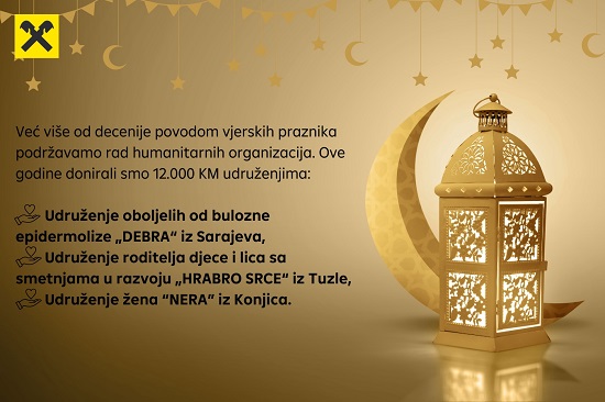 Povodom Ramazanskog bajrama, Raiffeisen banka je uručila donacije Udruženju oboljelih od bulozne epidermolize DEBRA iz Sarajeva, zatim Udruženju roditelja djece i lica sa smetnjama u razvoju HRABRO SRCE, te Udruženju žena NERA iz Konjica, a kako bi najugroženijim kategorijama naše društvene zajednice uljepšala ovaj praznik.