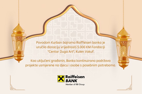 Povodom Kurban bajrama Raiffeisen banka je uručila donaciju u vrijednosti 5.000 KM Fondaciji ‘Centar Duga Art’ iz Kulen Vakufa. Cilj ove Fondacije je zbrinjavanje djece starosti do šest godina koja su privremeno ili trajno ostala bez roditeljske zaštite.