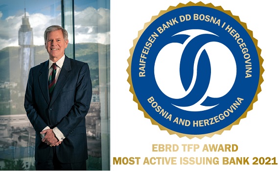 “Ponosni smo što je EBRD ponovo prepoznao Raiffeisen kao najaktivniju banku izdavaoca finansijskih instrumenata na bh. tržištu. I tokom protekle godine koja je bila izuzetno izazovna za poslovanje, nastojali smo pružati kontinuiranu podršku i ostati fer partner našim klijentima kada je riječ o svim segmentima našeg poslovanja, a to ćemo nastaviti raditi i ubuduće. Naše posebno zadovoljstvo je što već niz godina uspješno realizujemo partnersku saradnju s EBRD-om, kroz više različitih programa uključujući i ovaj”, izjavio je James Stewart, predsjednik Uprave Raiffeisen banke te se iskreno zahvalio iskusnom i profesionalnom timu Banke čije je svakodnevno zalaganje zaslužno za ovu nagradu.