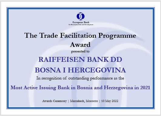 Na godišnjem sastanku i poslovnom forumu Evropske banke za obnovu i razvoj (EBRD), koji je ove godine održan u Maroku, u okviru programa TFP (Trade Facilitation Programme), dodijeljena su priznanja za 2021. godinu. Raiffeisen banci je pripala nagrada ‘Najaktivniji izdavaoc finansijskih instrumenata u Bosni i Hercegovini u 2021. godini’.