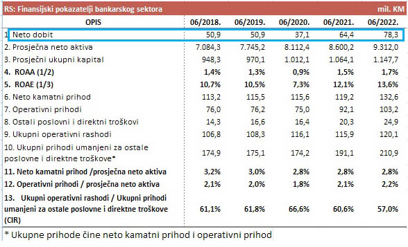 Komercijalne banke u Republici Srpskoj poslovale su u prvom polugodištu 2022. godine s neto dobiti u iznosu od 78,3 miliona KM, što je za 21,6 posto više nego u istom periodu prošle godine kada je profit banaka iznosio 64,4 miliona KM.